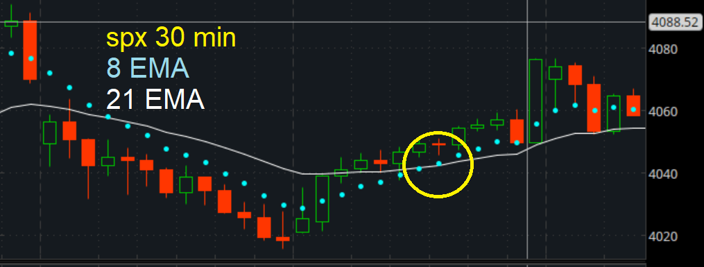A term Peter uses often in Weekly Options Advisory live sessions to note when the 8 period EMA moves through the 21 period EMA on the SPX cash 30 minute chart. This can happen in either direction; there can be a pinch up or a pinch down.