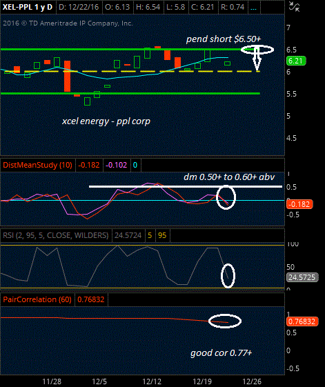 (Excel Energy – PPL Corporation) I am not that surprised to see the pair pull-back after “XEL” going ex-dividend on Thursday. Also, as I suspected, the pair needs a day or two to catch its breath and push back up to our pending short entry of $6.50 or so. I am keeping my alert and my strategy short for the pair unless it breaks lower on Friday’s (RTHRegular Trading Hours. In the /ES this means the price action from 9:30am EST to 4:15pm EST only.) session.