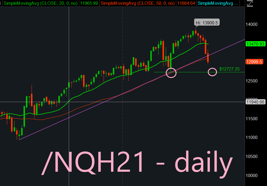 In yesterday’s Premarket Perspective I included a chart of the /NQH21 showing a potential test of trendline support. That trendline was violated last night and current prices are well below. Let’s start with that chart again before we slice things up on a more granular level…