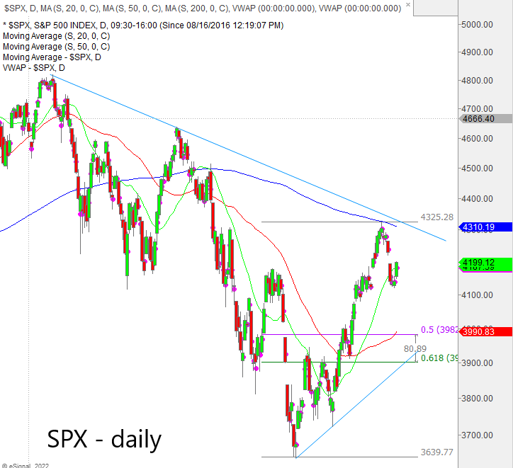The upcoming speech should be the definitive clue as to whether or not this market wants to add on to yesterday’s rally or return to recent swing lows and continue on to the Fibonacci retracement levels below. To that end, I’ve chosen an SPX daily chart for today which has some trend lines and the Fibs drawn in. It’s about a 50/50 shot right now as whether it’s going to be 4300 or 4100.
