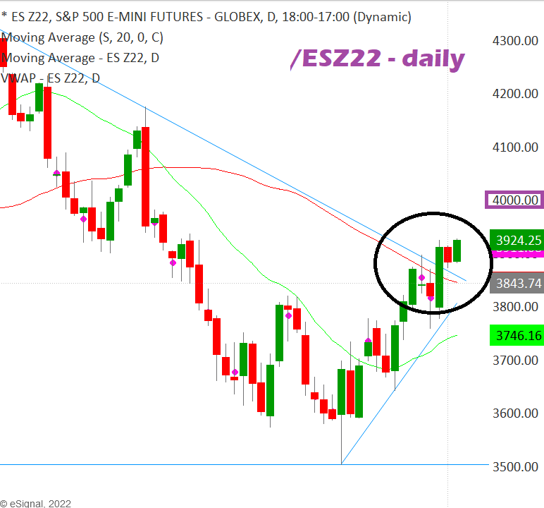 With the recent bullishness, there is potential that /ES wants to move to the next large round number which would be 4,000 as seen in the chart below.